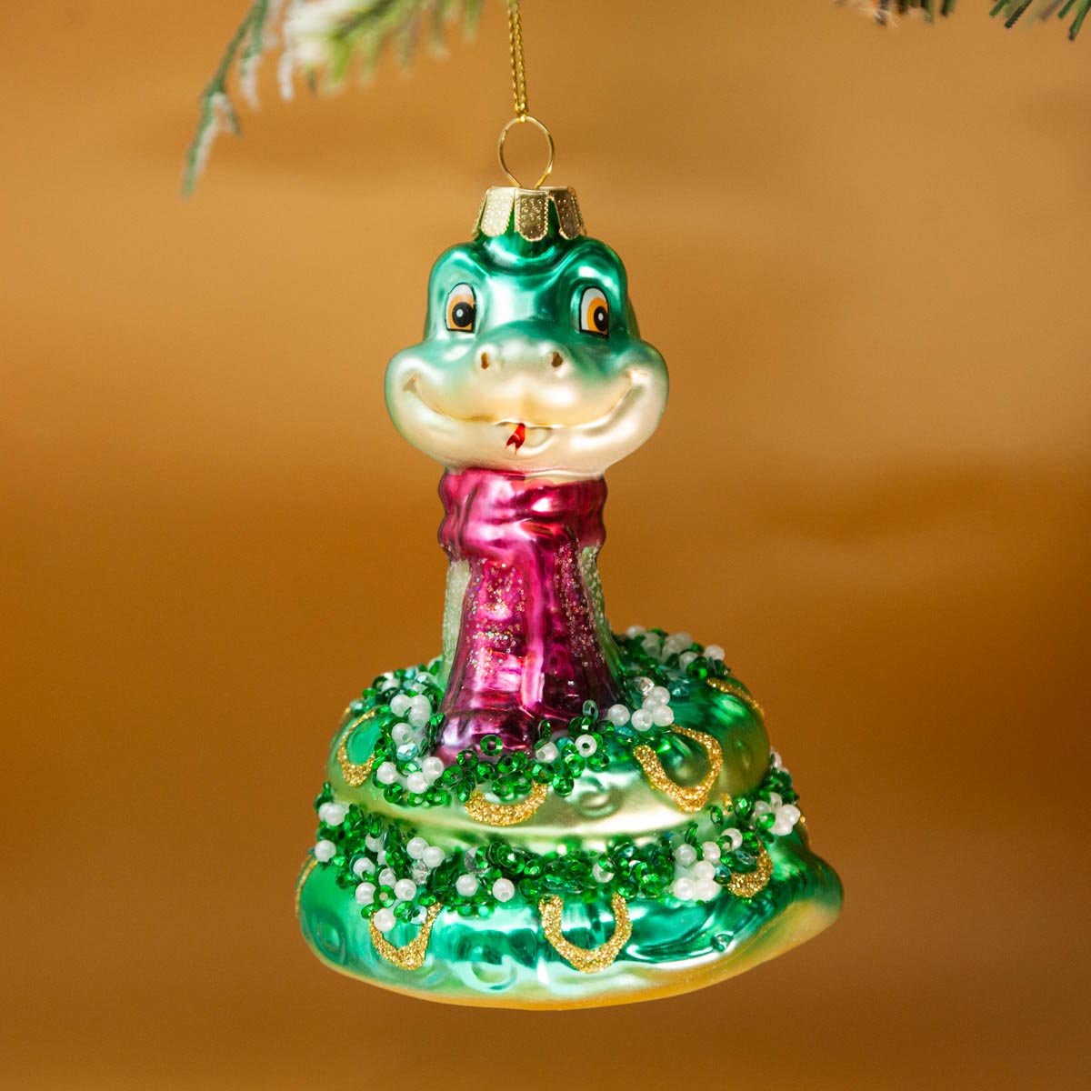 Украшение елоч Змея в шарфике бирюзовая стекло 7,5х7х11,5см GLT11
