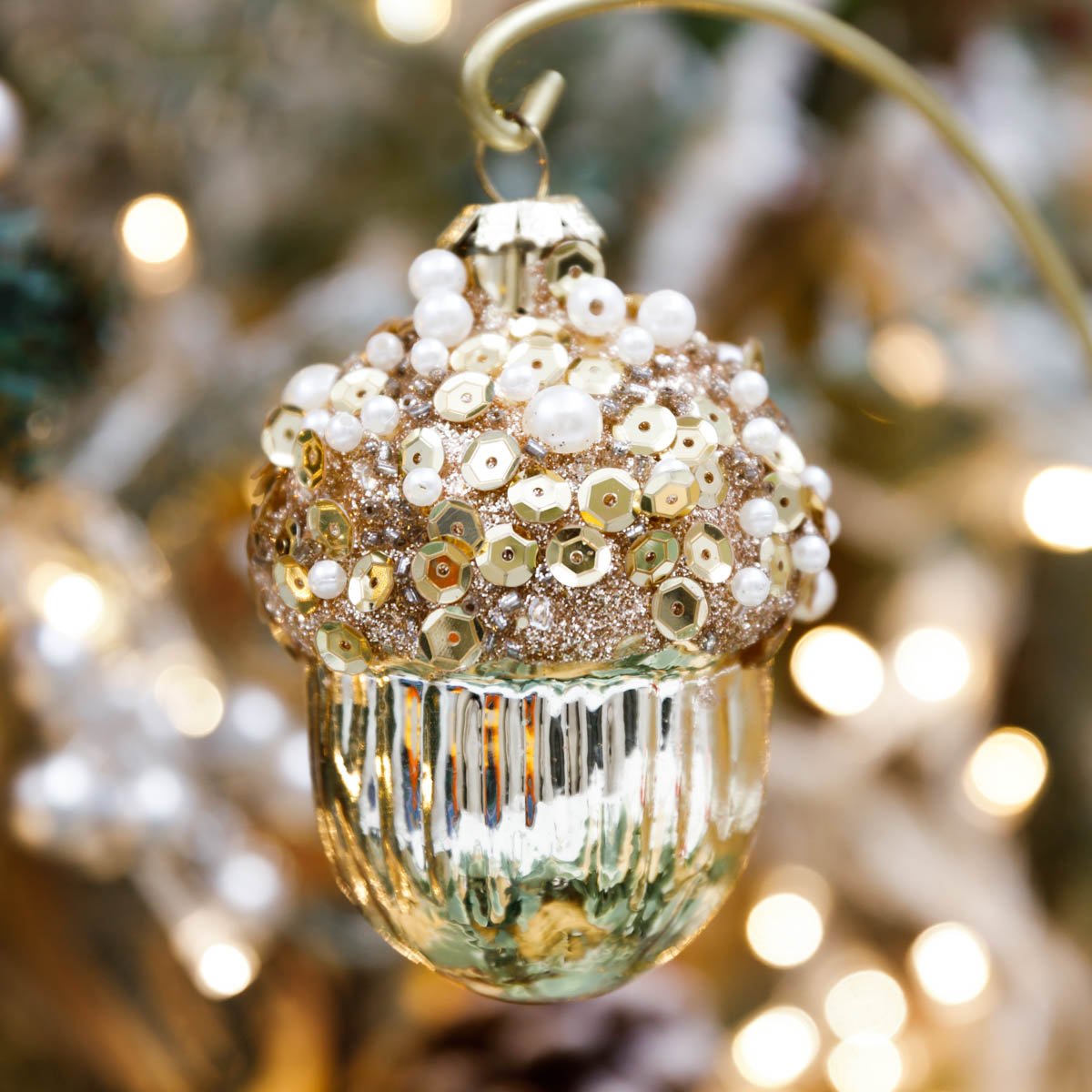 Украшение елочное Желудь с жемчужин бисер/пайетками золотой стекло6х8см