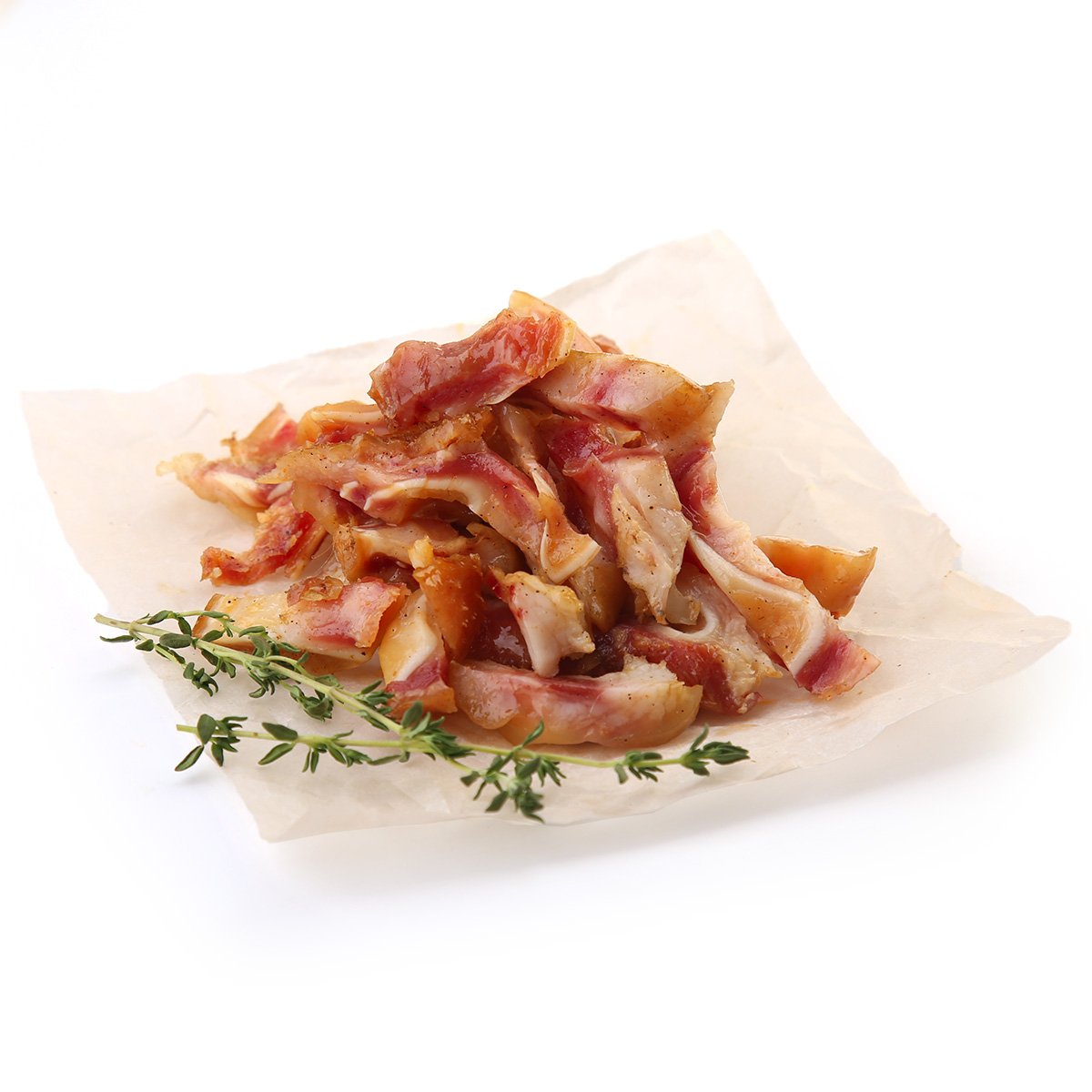 Сытная и ароматная закуска к пиву. Отварные свиные ушки нарезаны соломкой, зажарены до золотистой корочки, сдобрены пряностями и охлаждены для подачи к столу.
