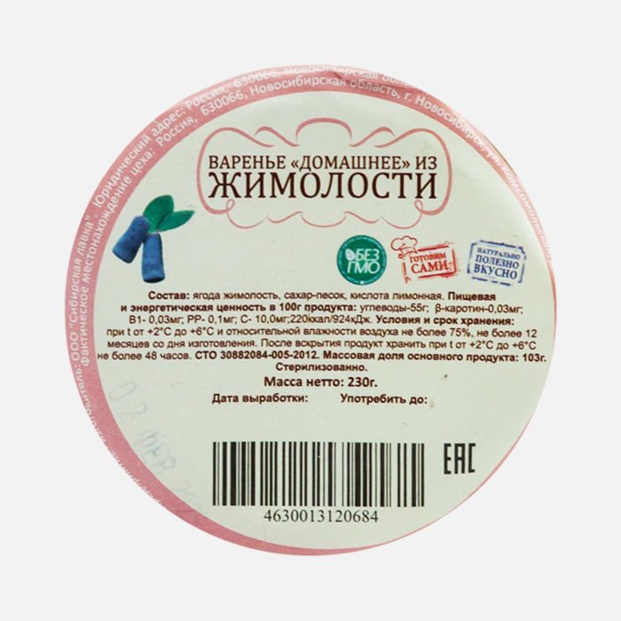 Жимолость свежая, сахар-песок, кислота лимонная. Витамины: ß - каротин 0,03мг; В₁ - 0,03мг; РР - 0,1мг; С - 10,0мг