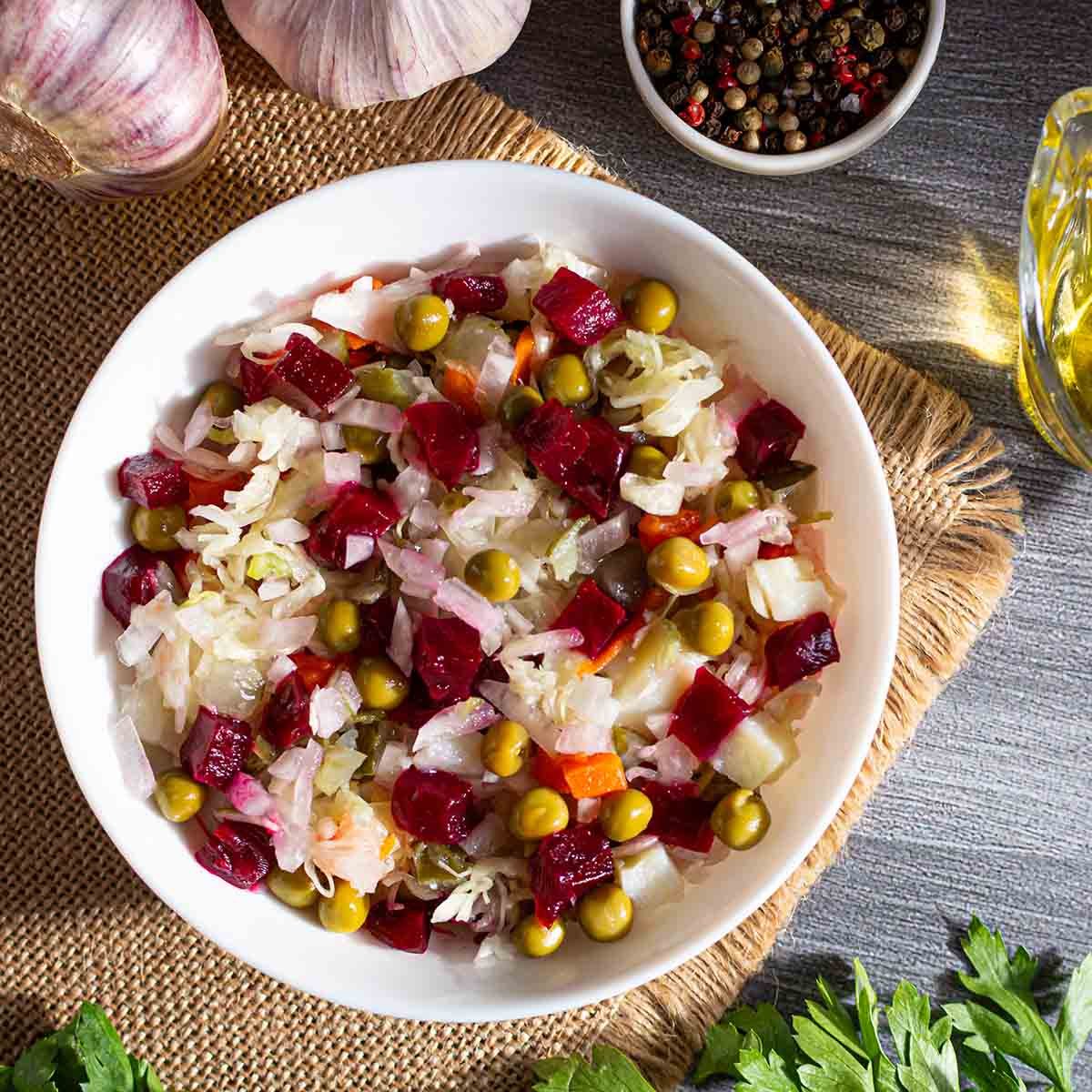 Картофель, свекла, капуста квашеная, морковь, огурцы консервированные, лук репчатый, зеленый горошек консервированный, масло подсолнечное нерафинированное, сахар, соль.