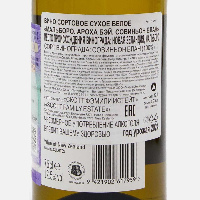 Вино Ароха БэйМальбороСовиньонБлан сорт бел сух 7.5-12% ст/б 0,75л