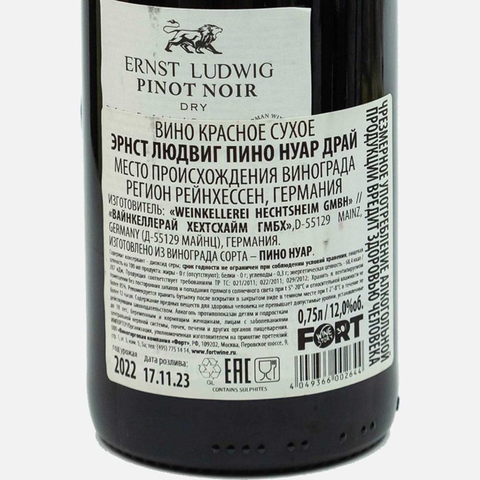 Вино Эрнст Людвиг Пино Нуар драй кр сух 11-12% ст/б 0,75л