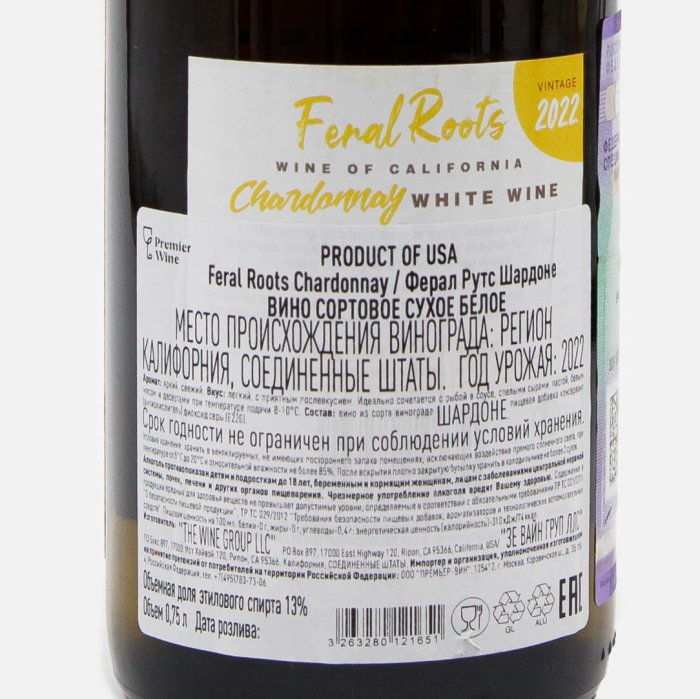 Вино Ферал Рутс Шардоне бел сух 12.5-13% ст/б 0,75л