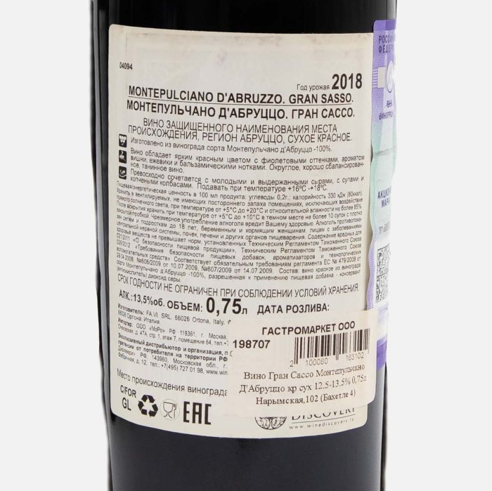 Вино Гран Сассо Монтепульчано Д'Абруццо кр сух 12.5-13.5% 0,75л