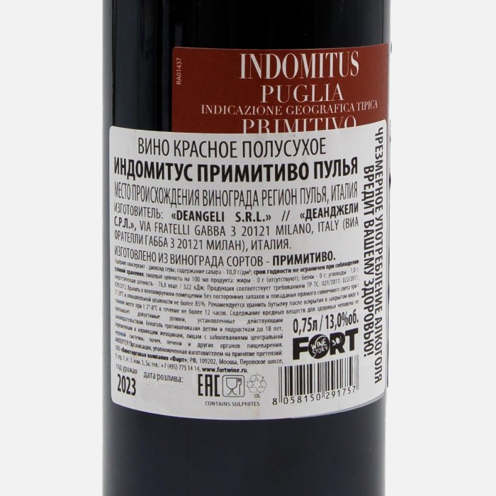 Вино Индомитус Примитиво Пулья кр п/сух 13% ст/б 0,75л