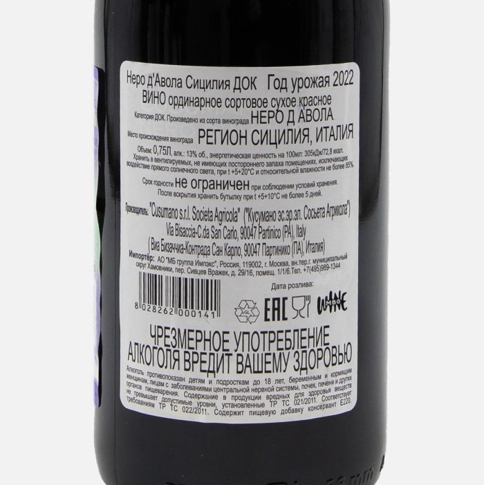 Вино Кусумано Неро д'Авола Сицилия орд сорт кр сух 7.5-14% ст/б 0,75л