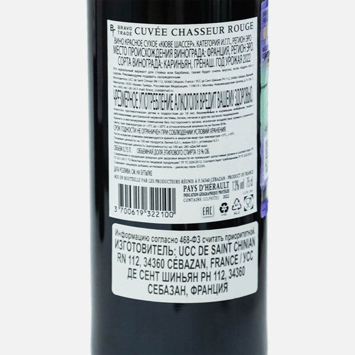 Вино Кюве Шассер ИГП кр сух 13% ст/б 0,75л