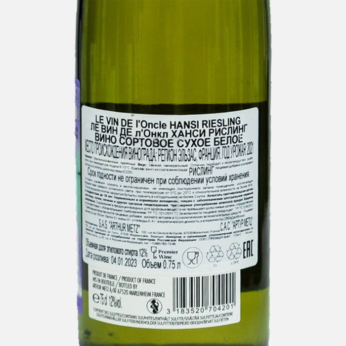 Вино Ле Вин де л'Онкл Ханси Рислинг сорт бел сух 12% ст/б 0,75л