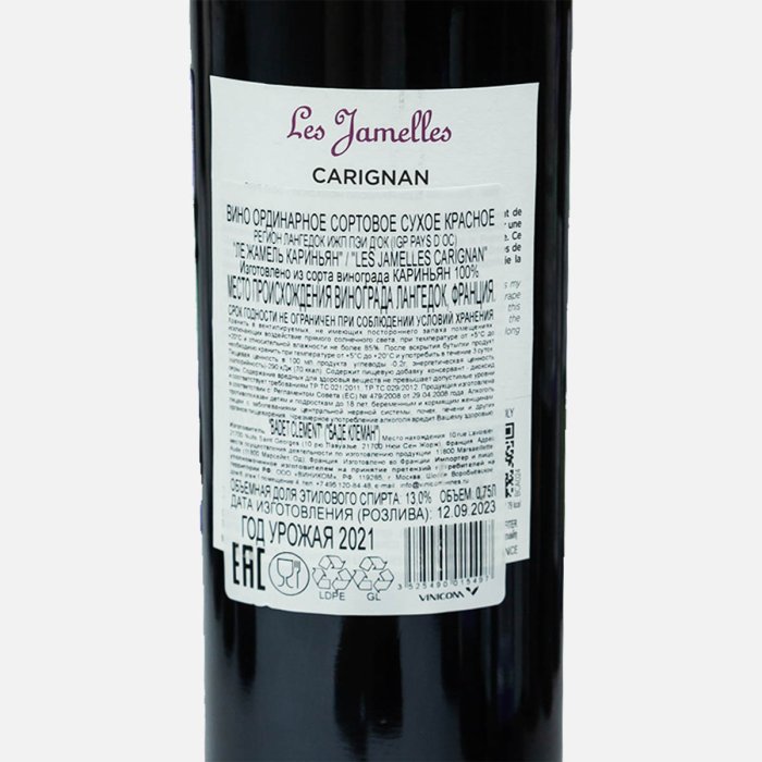 Вино Ле Жамель Кариньян ИЖП орд сорт кр сух 13-14% ст/б 0,75л