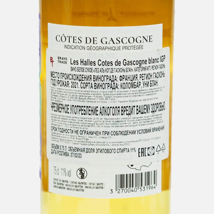 Вино Лез Аль Кот де Гасконь Блан ИГП бел сух 7.5-11% ст/б 0,75л