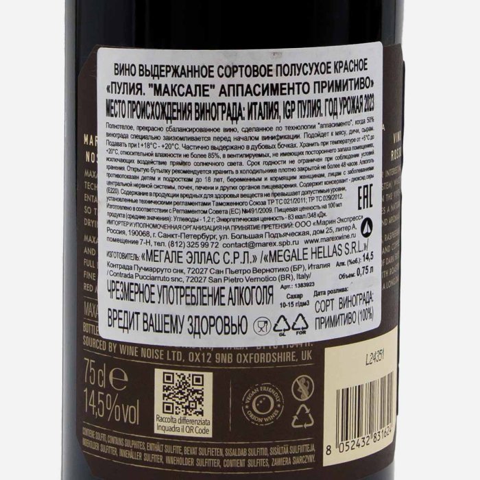 Вино Максале Аппасименто Примитиво Пулия выд сорт кр п/сух 14.5% 0,75л
