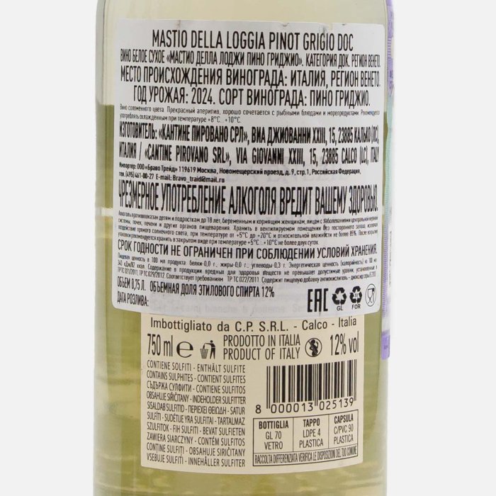 Вино Мастио делла Лоджи Пино Гриджио ДОК бел сух 7.5-12% ст/б