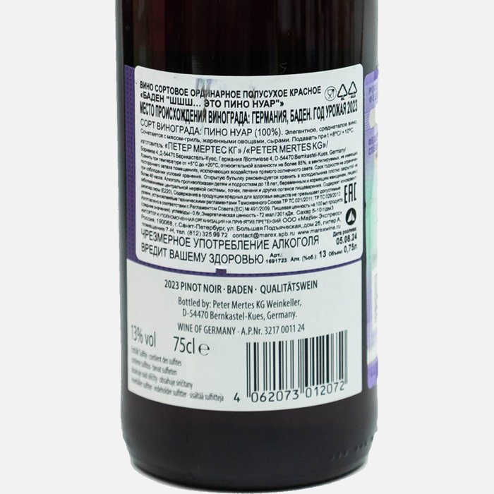Вино Петер Мартес Баден Шшш ЭтоПино Нуар сорт орд кр п/сух 12%ст/б 0,75