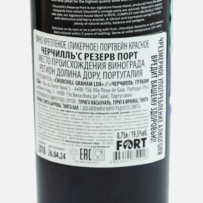 Вино Портвейн Черчилль'с Резерв Порт креп ликер кр 19.5% ст/б 0,75л