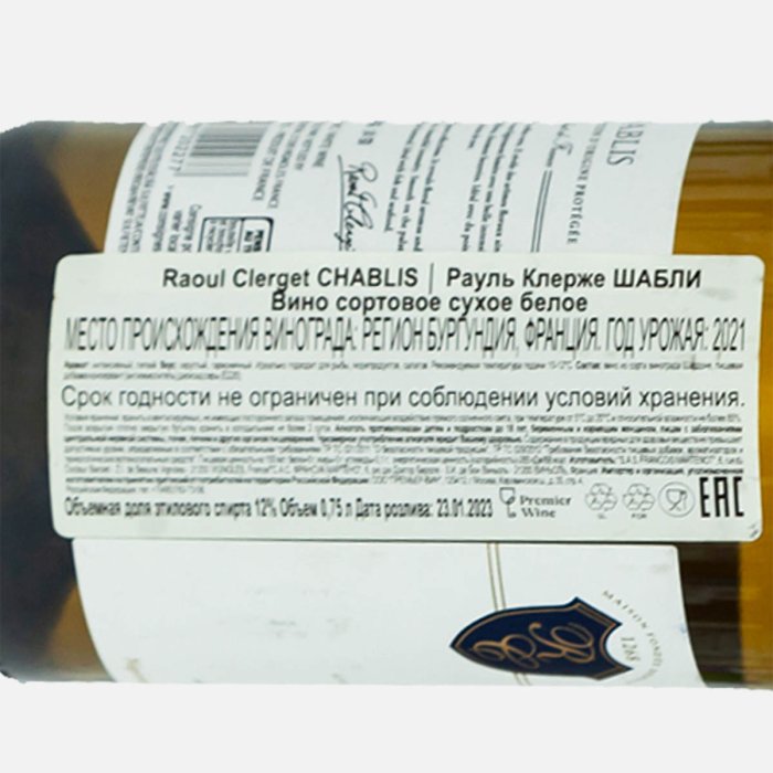 Вино Рауль Клерже Шабли сорт бел сух 12-12.5% ст/б 0,75л
