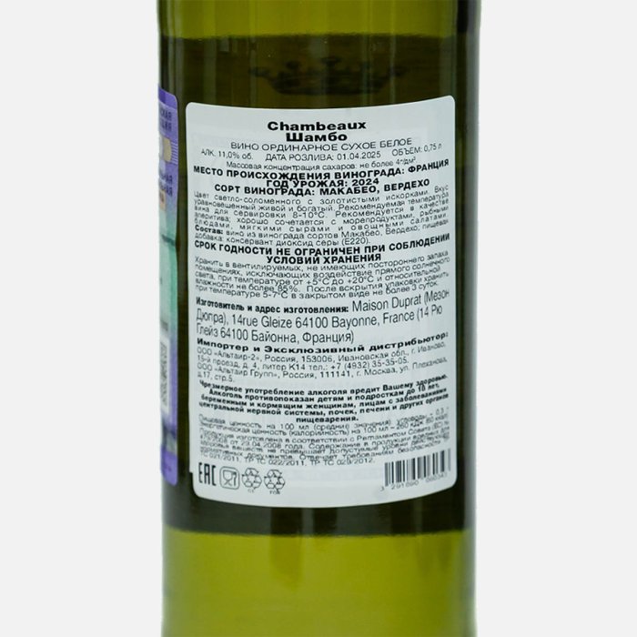 Вино Шамбо бел сух 8.5-12% ст/б 0,75л