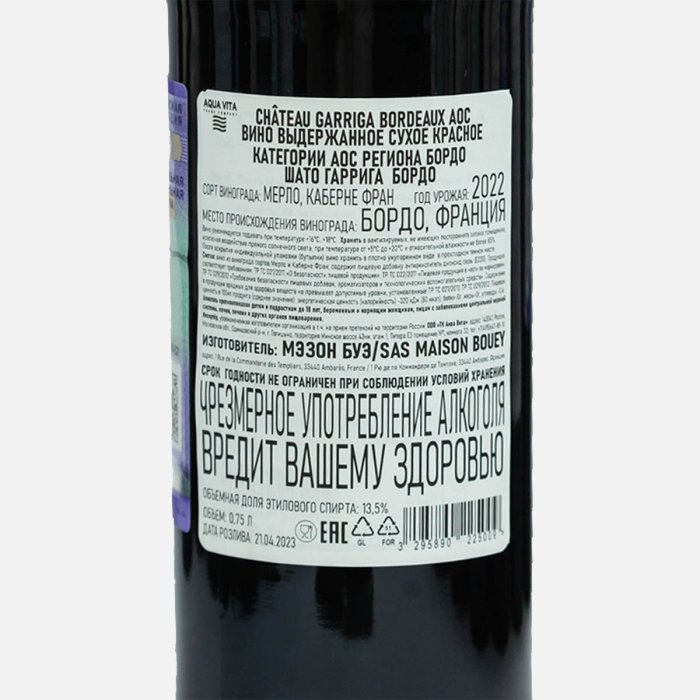 Вино Шато Гарига Бордо АОС выдер кр сух 10.5-13.5% ст/б 0,75л