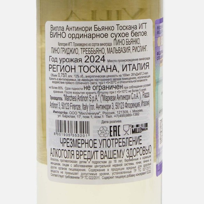 Вино Вилла Антинори Бьянко Тоскана ИГТ бел сух 7.5-12% ст/б 0,75л