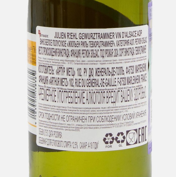 Вино Жюльен Риль Гевюрцтраминер АОП бел п/сух 12-14% ст/б 0,75л