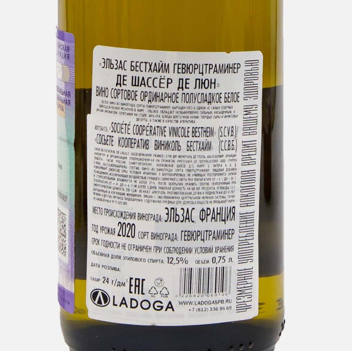 ВиноЭльзасБестхаймГевюрцтраминер де Шассер деЛюн бел п/сл7.5-13%0,75л