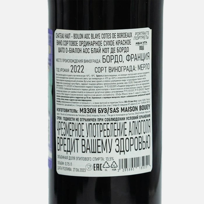 ВиноМэзонБуэШатоО-БуалонАОС БлайКот деБордоПортреты сорт орд кр сух0,75