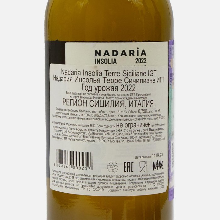 ВиноНадарияИнсольяТерреСичилианеИГТ бел сух 7.5-12.5% ст/б0,75