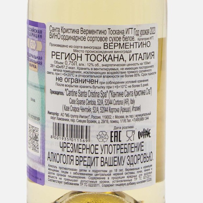 ВиноСантаКристинаВерментиноТоскана ИГТ бел сух7.5-12%ст/б0,75