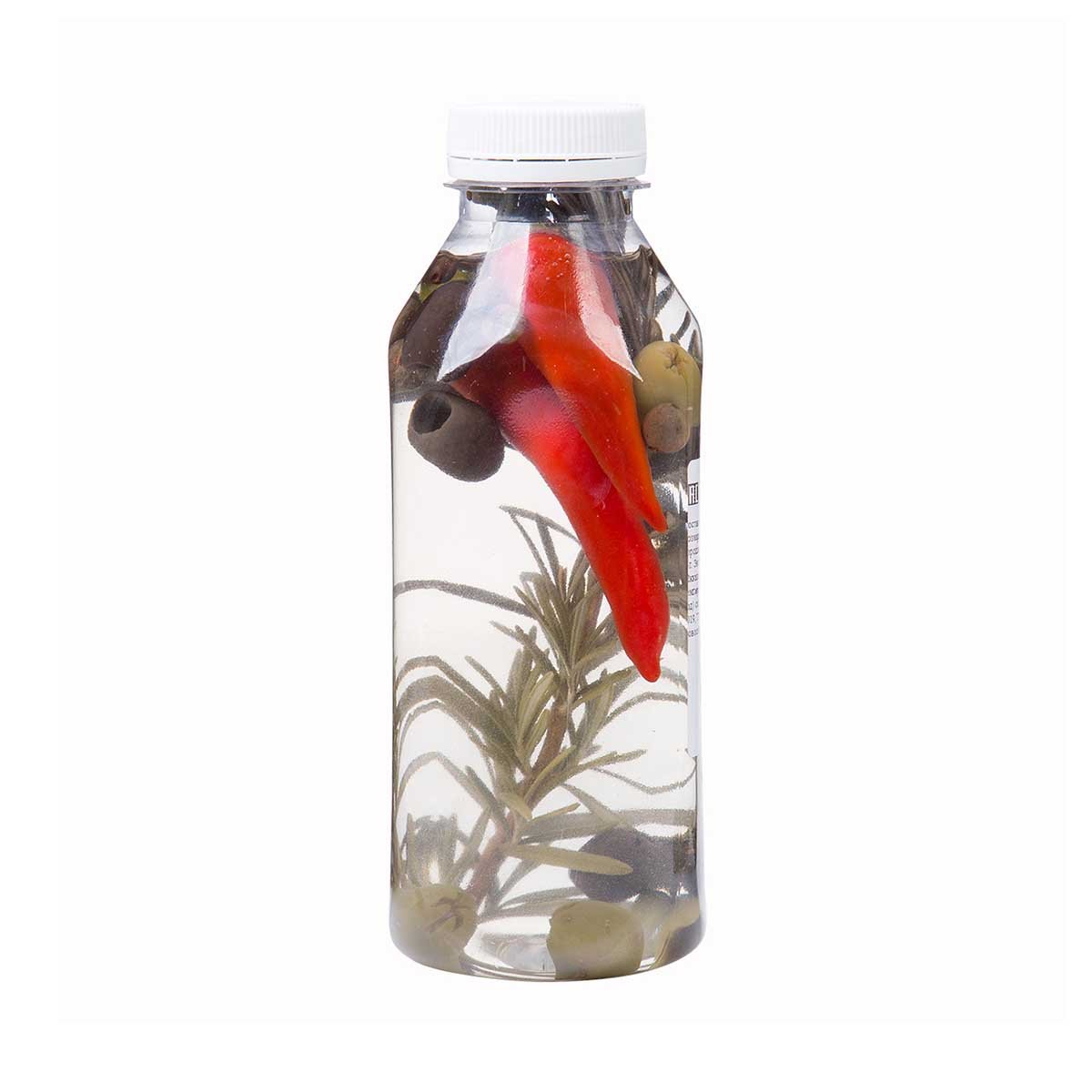 Уксус столовый 5%, зелень розмарина, перец душистый горошек, перец розовый, перец жгучий (стручок), маслины консервированные.