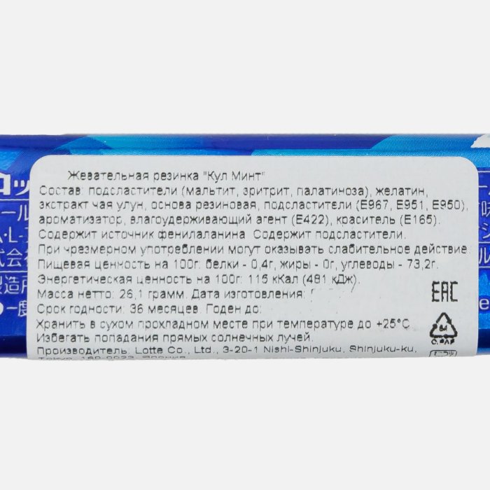 мальтит, эритрит, жевательная основа, подсластители (ксилит, аспартам, ацесульфам), ароматизатор (мята), смягчитель, палатиноза, экстракт чая оолонг, краситель растительного происхождения. Содержит источник фенилаланина.